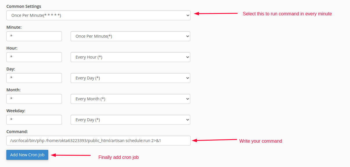 Secondly, inside the "Cron Jobs" section add /path_to_php_folder /your_project_root_folder/artisan schedule:run 2>&1 command, which will run every minute. To run a cron job every minute, please select the "Once Per Minute" option from the "Common Settings" dropdown above. You have to replace "/path_to_php_folder" with the php folder location in your server and "/your_project_root_folder/" with the location of your project root folder. Which will look like the following image.