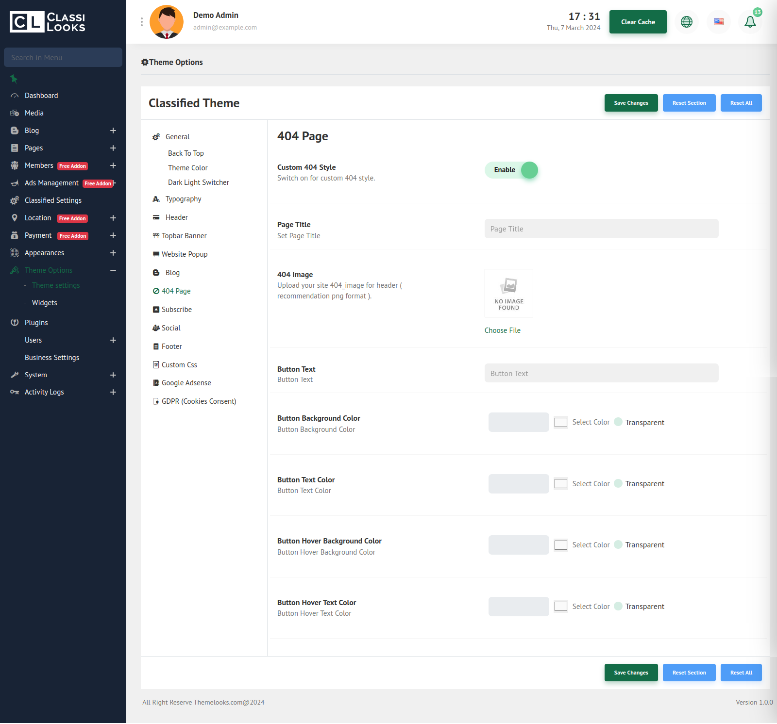 Click Save Changes to save theme options. Click Reset Section to reset only this section. Click Reset All to reset all theme options.