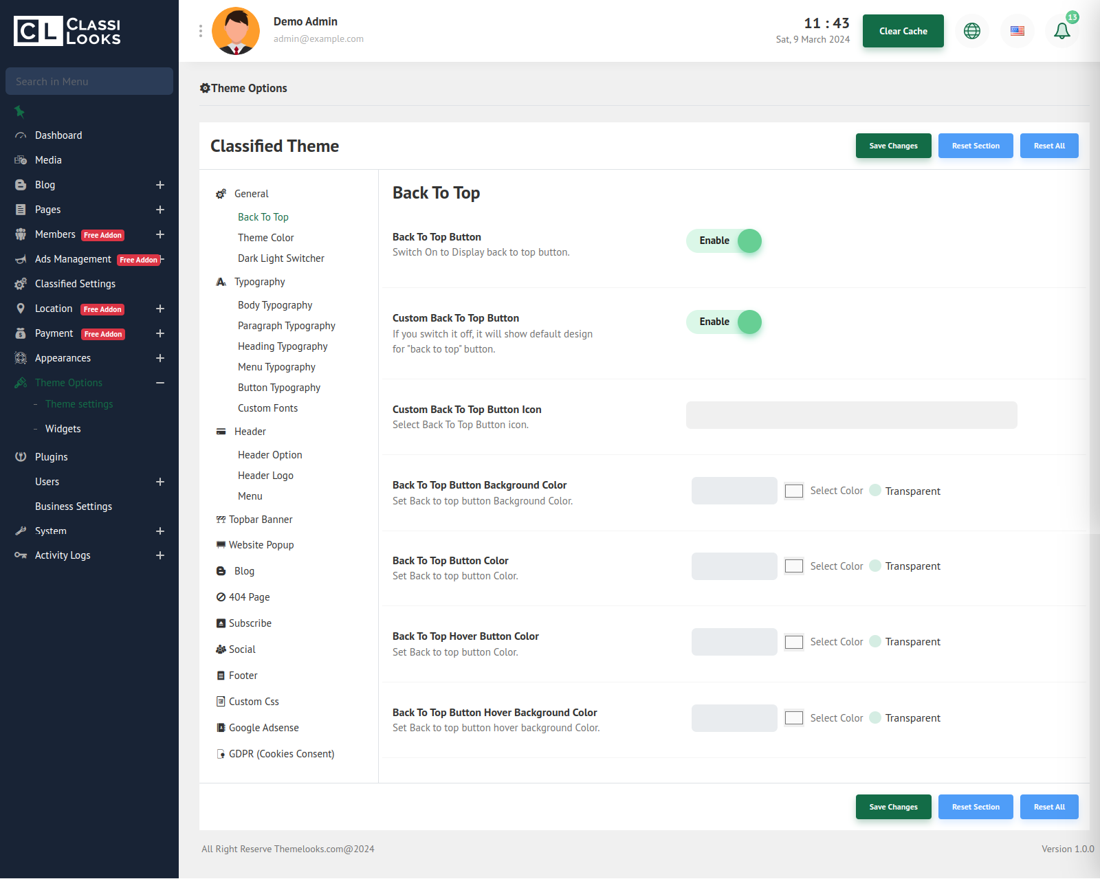 Click Save Changes to save theme options. Click Reset Section to reset only this section. Click Reset All to reset all theme options.