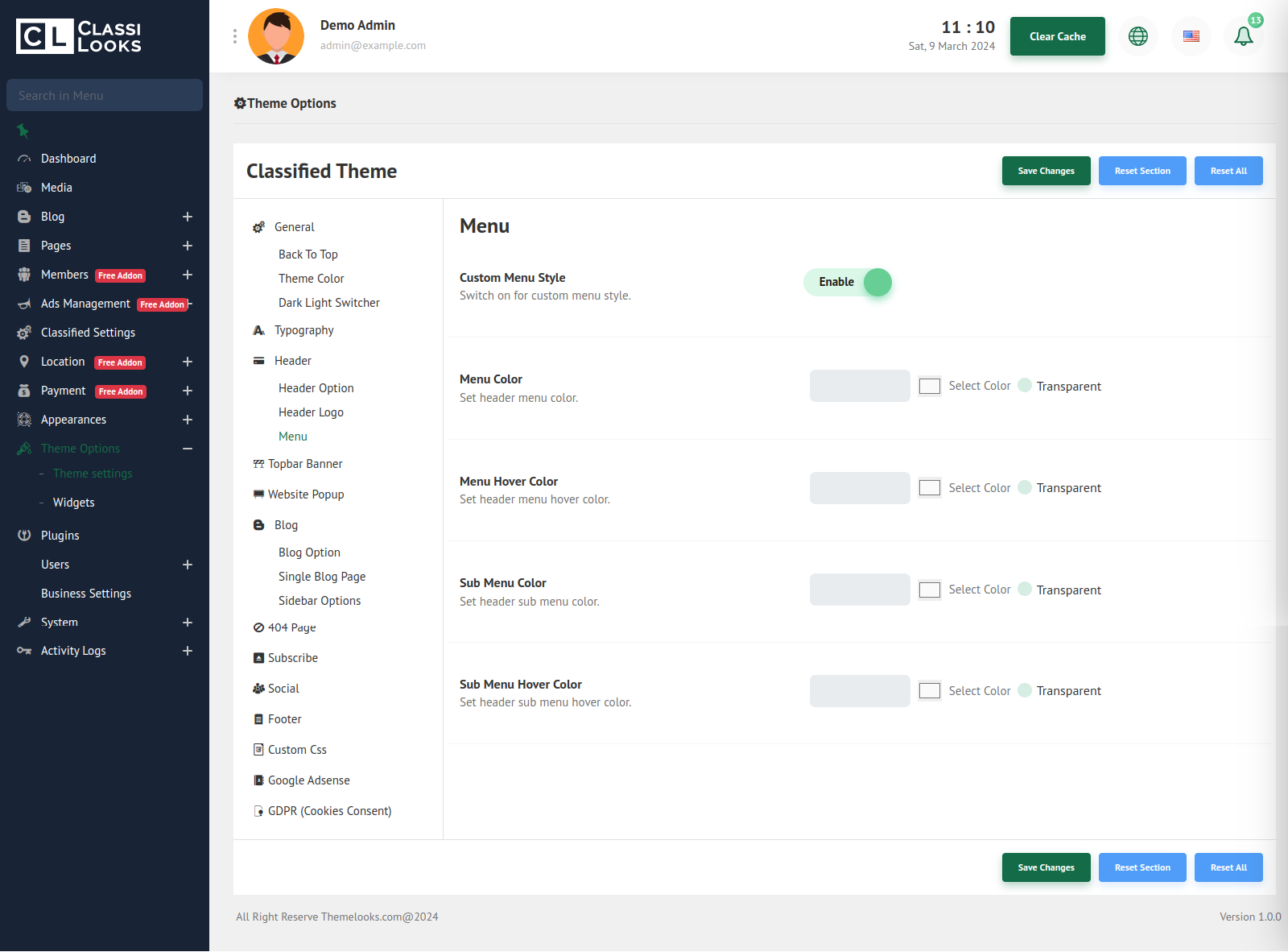 Click Save Changes to save theme options. Click Reset Section to reset only this section. Click Reset All to reset all theme options.
