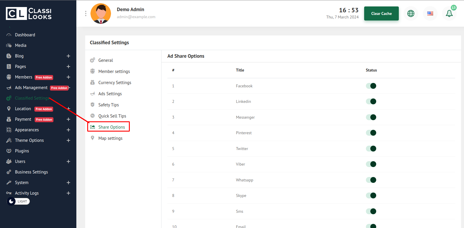 A Customer can share the ad link in many media. Here on this page, all the options are available and you can select which options to show. You can turn off the status to hide any option. Go to Classified Settings > Share Options.