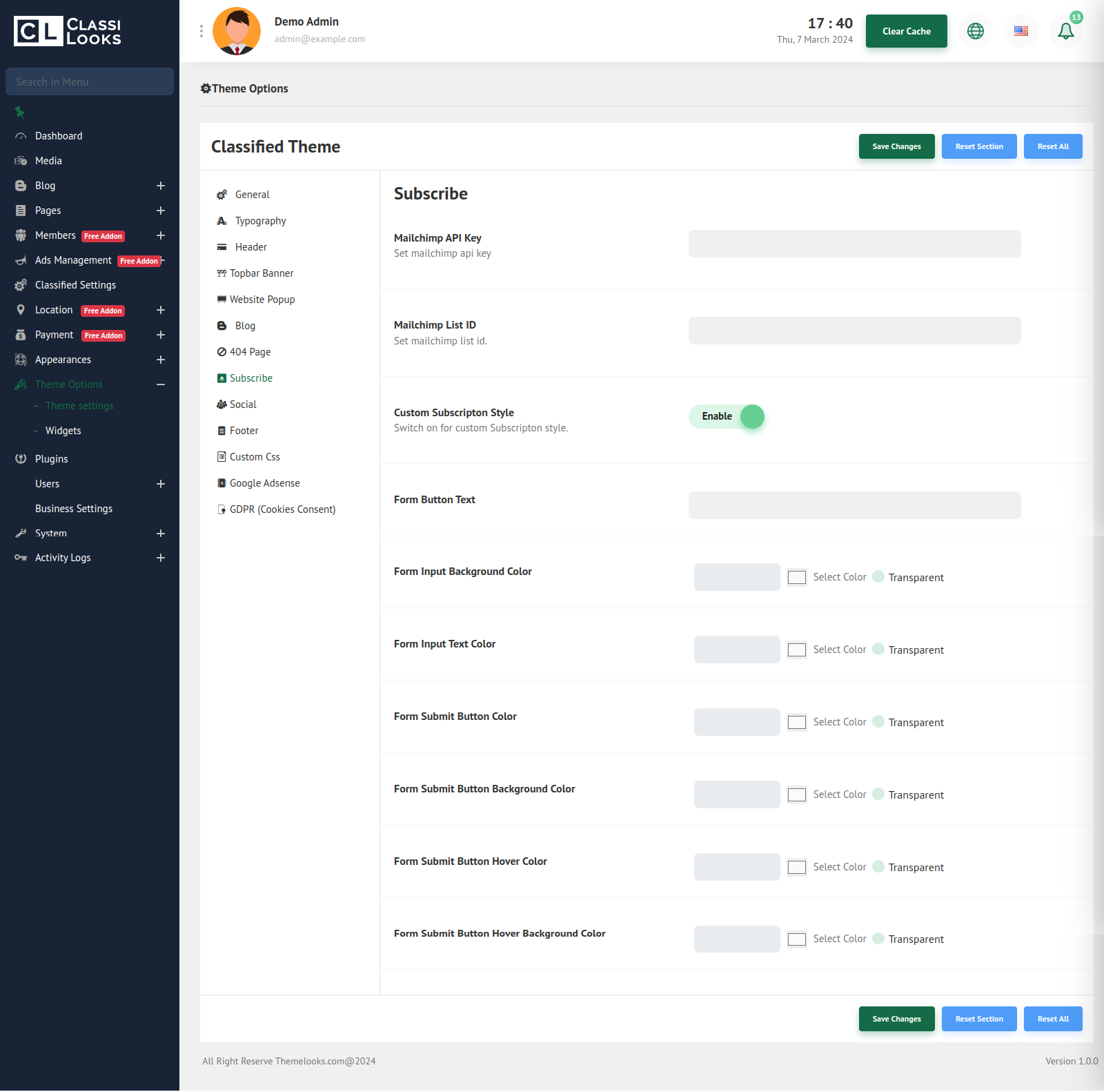 Click Save Changes to save theme options. Click Reset Section to reset only this section. Click Reset All to reset all theme options.