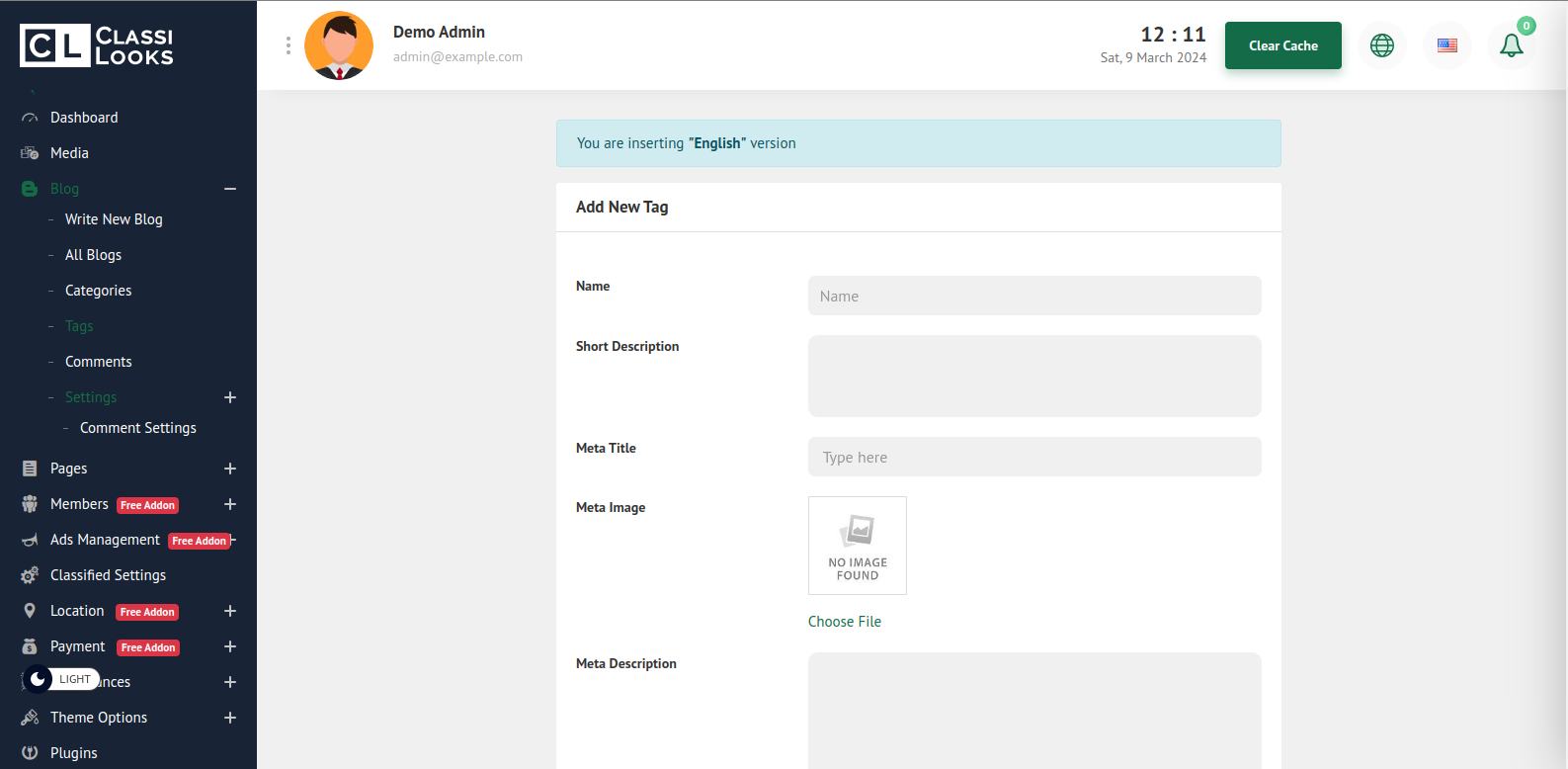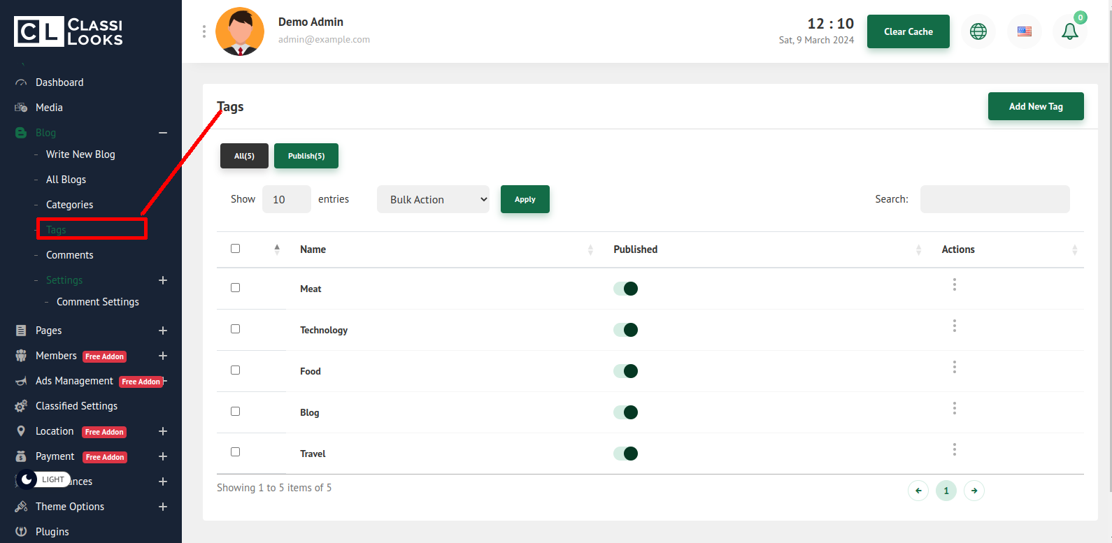 In this post, we will learn how to manage Blog Tags. Follow Blogs > Tags and you will be redirected to the tag list page. Here you can find all the available tags, you can search and find, filter, manage, delete and create new ones.