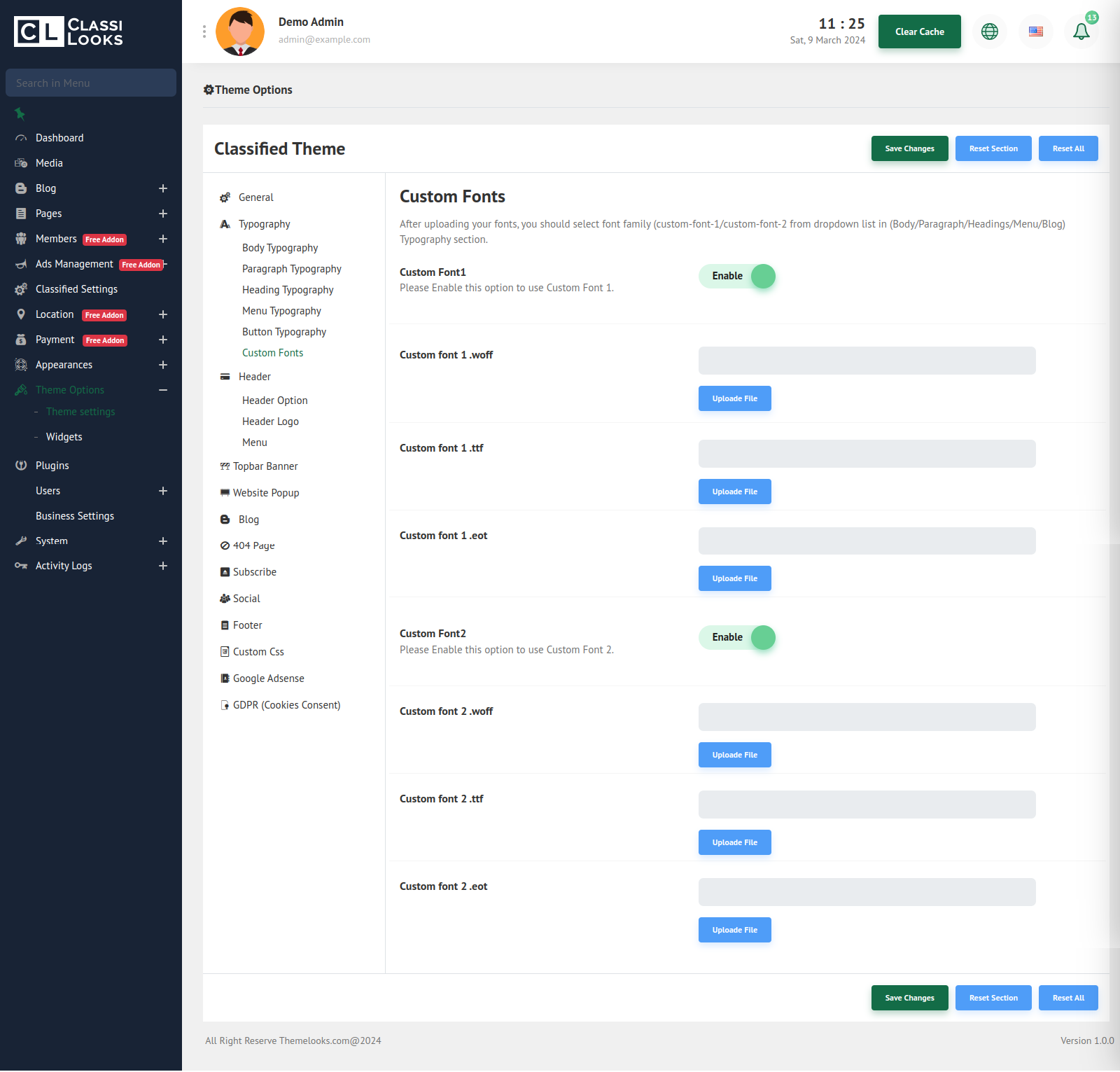 There are two custom font systems. You have to switch on to use a custom font. Here are three fields available, you can add three different types of fonts so that if a font file fails to show the style another file will be used. So it is best to give fonts woff, Ttf, and eot files. After uploading your fonts, you should select the font family (custom-font-1/custom-font-2 from the dropdown list in (The Body/Paragraph/Headings/Menu/Blog) Typography section.