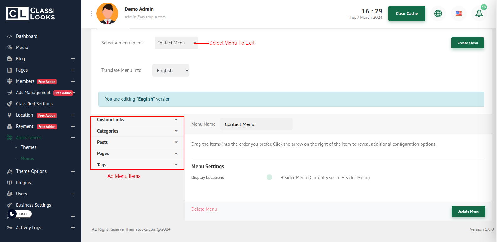 - You can delete a menu by clicking Delete Menu Button. You can assign a menu to the three header location and save it.