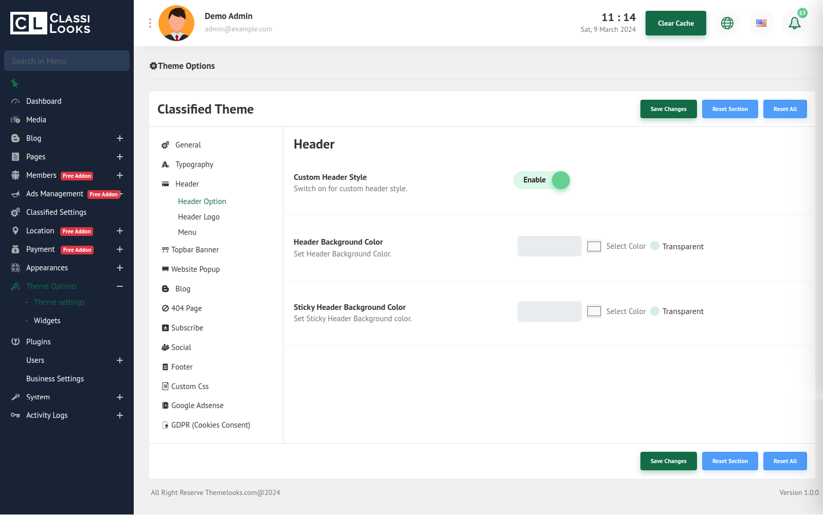 Click Save Changes to save theme options. Click Reset Section to reset only this section. Click Reset All to reset all theme options.