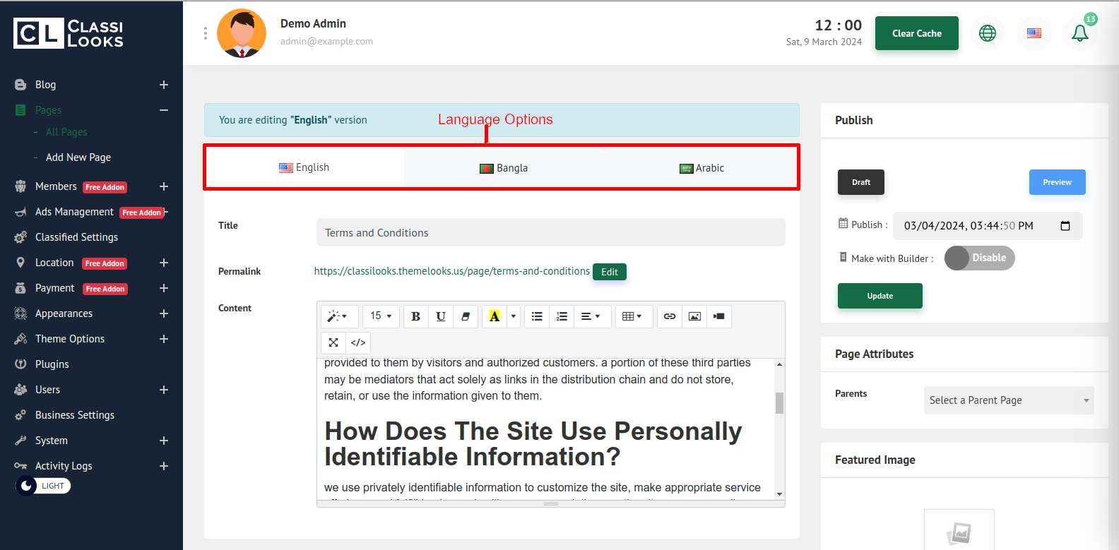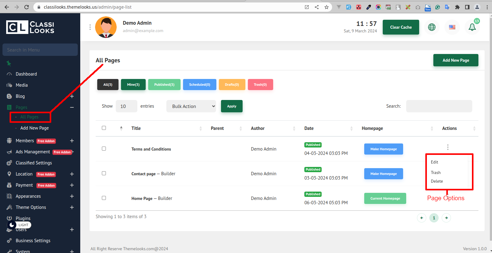 In this post, we will learn how to manage Pages. Follow Pages > All Pages and you will be redirected to the page list page. Here you can see all the pages and filter them by status, search page, and manage page, and also can create new pages. Make a page homepage and edit the page with the builder.
