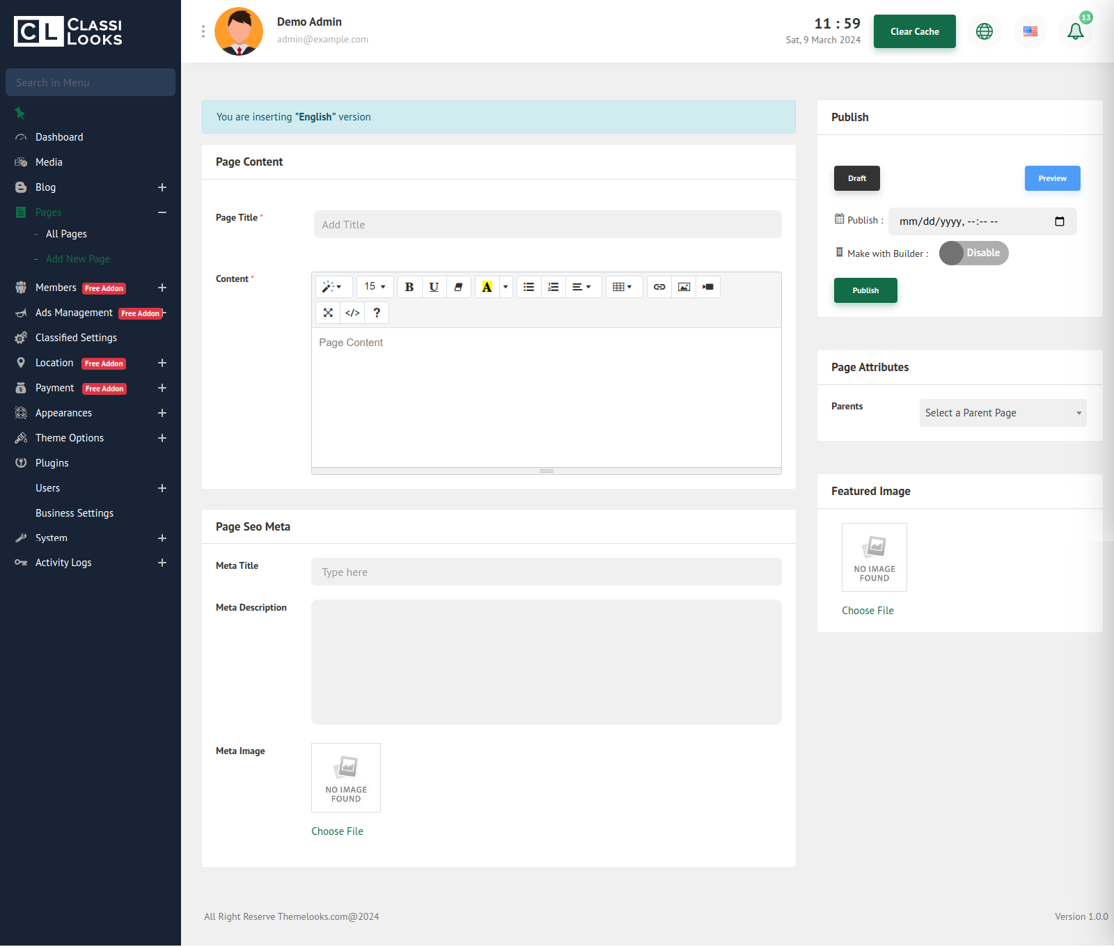 To create a new page click the Add Page button or follow Pages > Add New Page and you will be redirected to add another page. Here you can create new pages, or make drafts to edit later and also can schedule a date or select to build the page with builder.