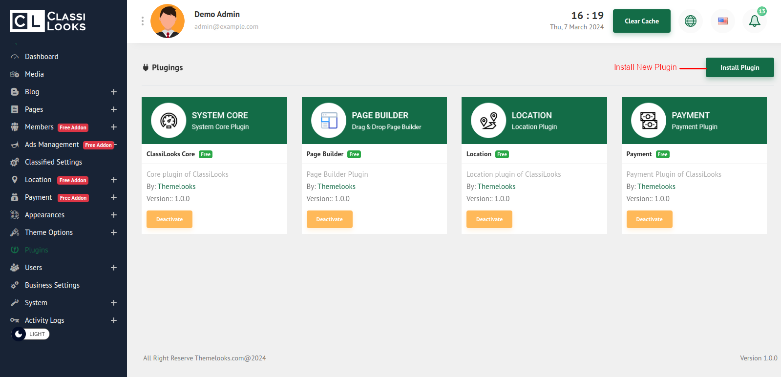 ClassiLooks has multiple plugins to run the system properly. You can easily manage these plugin from the plugin module. In this post, you will learn how to activate and deactivate Plugins. Follow Plugins from the sidebar.