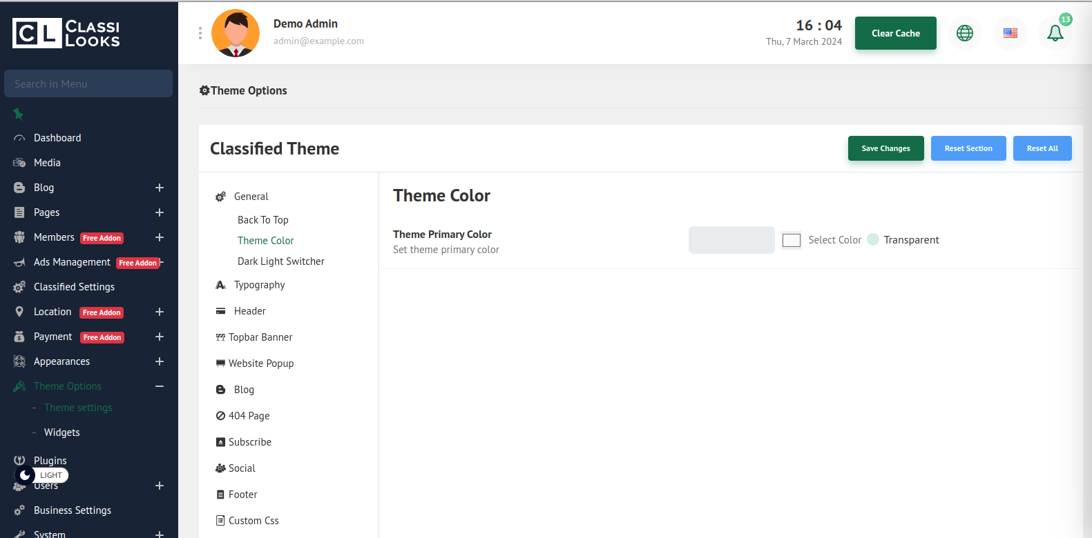 Click Save Changes to save theme options. Click Reset Section to reset only this section. Click Reset All to reset all theme options.