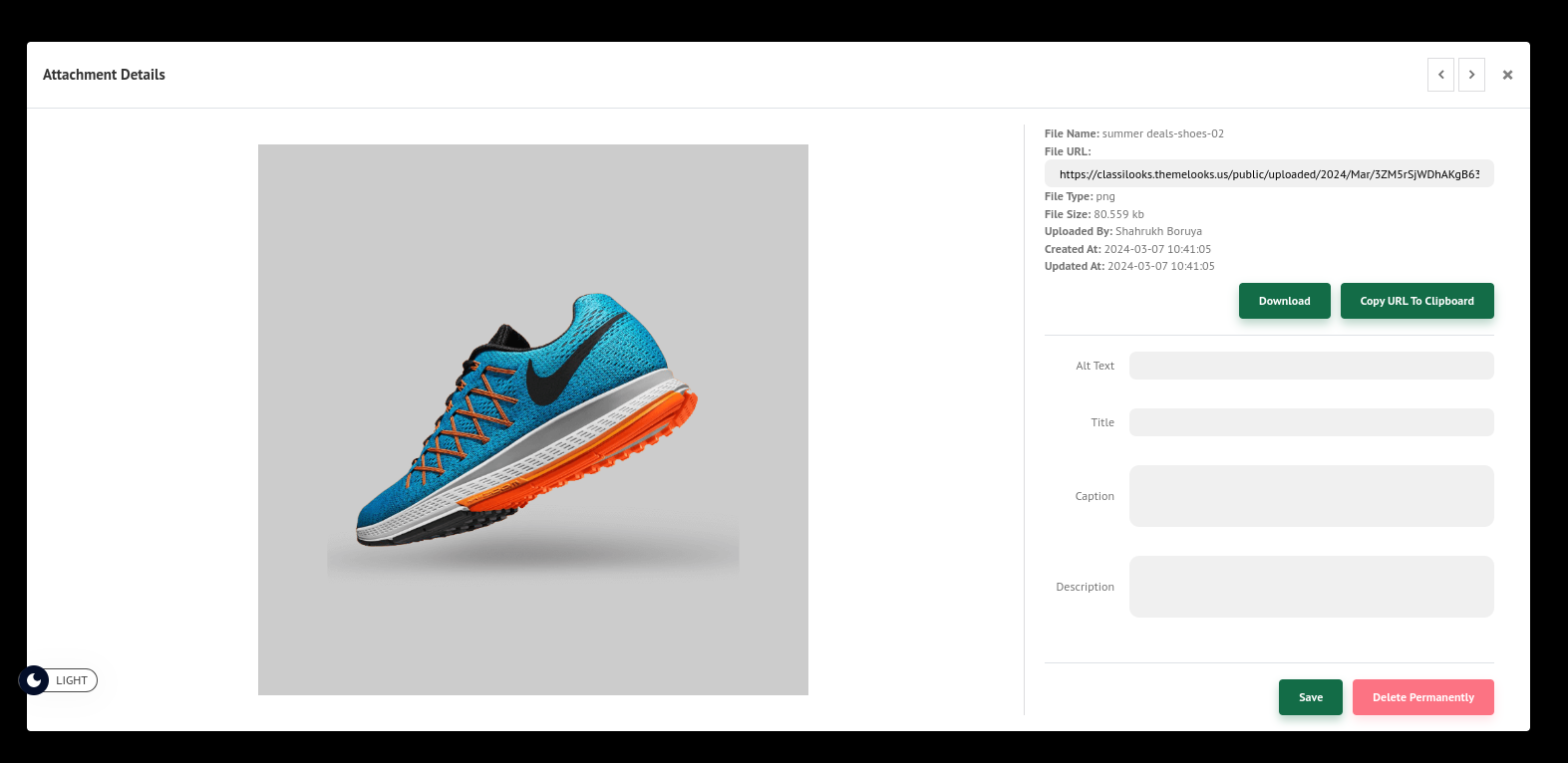If you want to find one specific file's details click on that file. It will open a model about file details. You can set some details or delete that file.