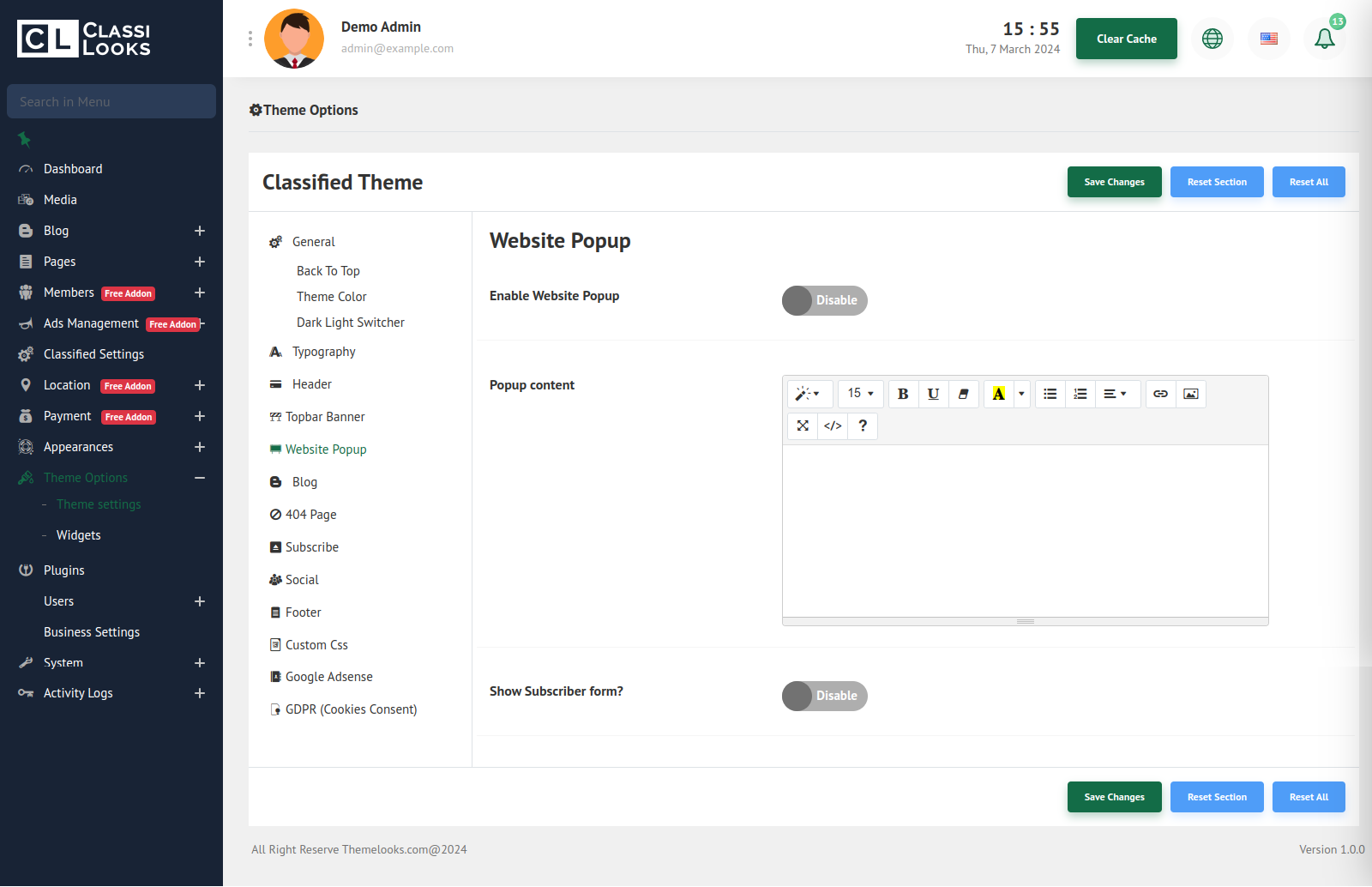 To Manage Website Popup follow Theme Options > Theme Settings. Then Click on the Website Popup Tab.