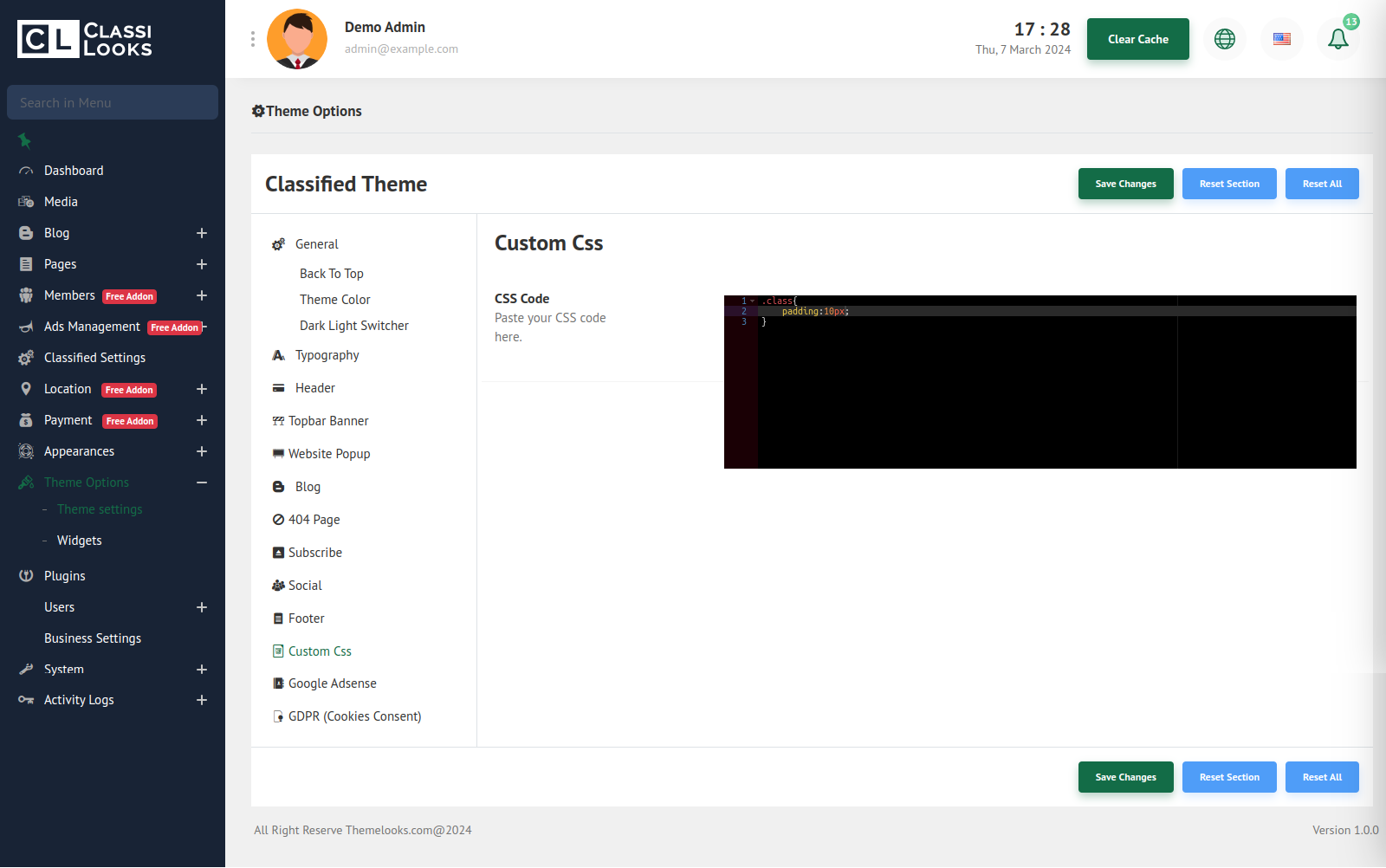 Click Save Changes to save theme options. Click Reset Section to reset only this section. Click Reset All to reset all theme options.
