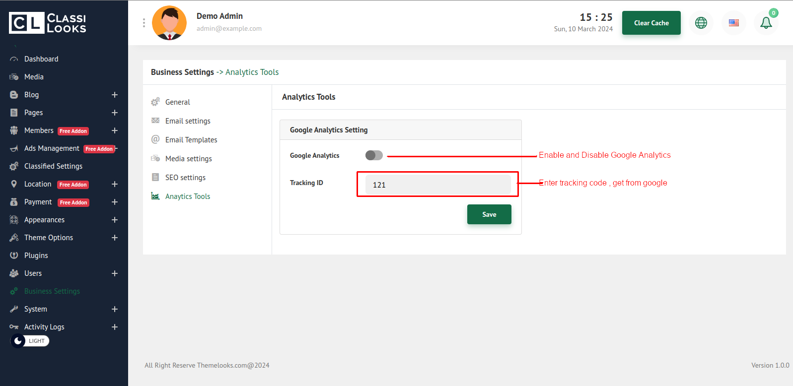 To install Google Analytics, you need to go to Business Settings > Analytics Tools Module