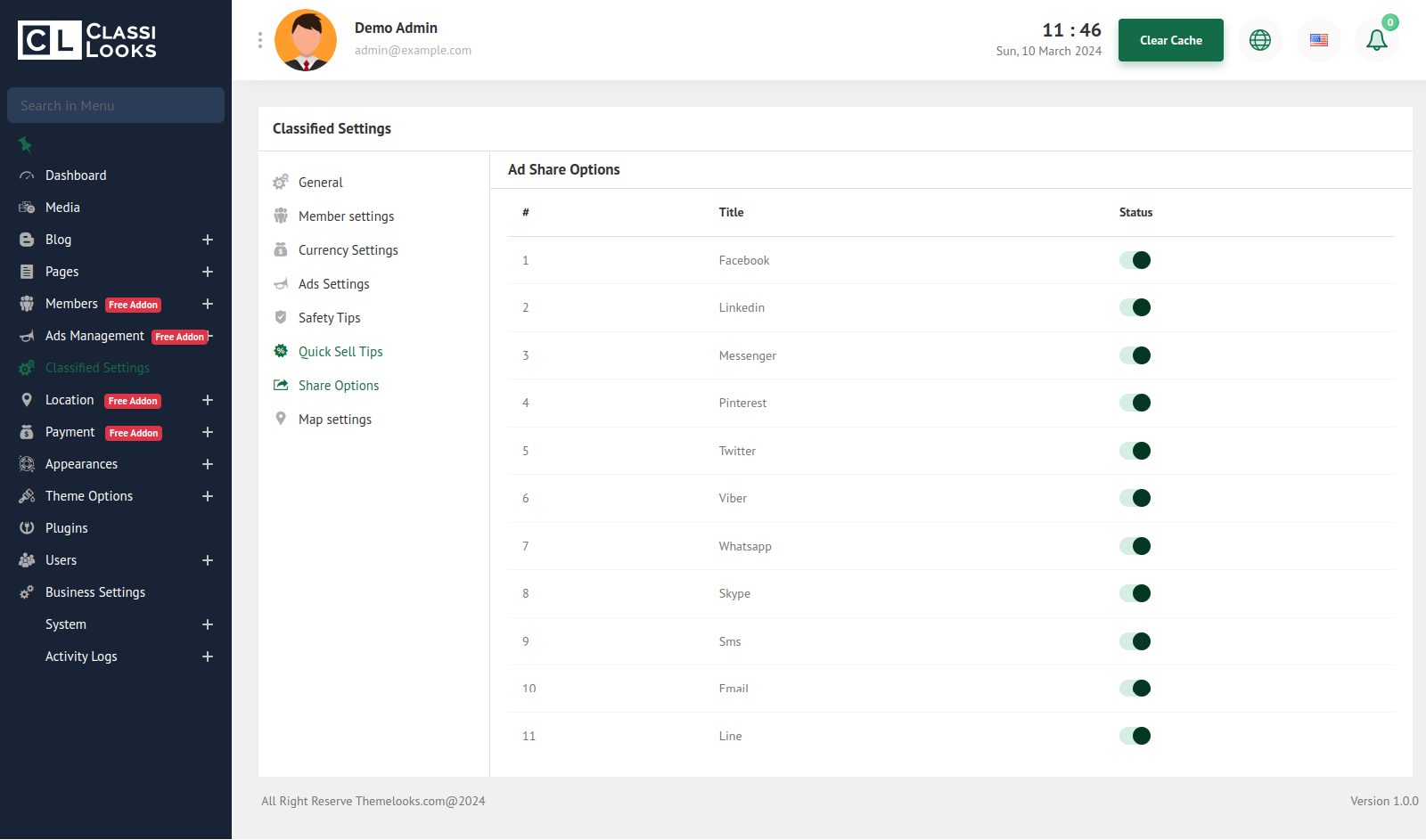 For managing ad share options you need to go to Classified Settings > Share Options Module