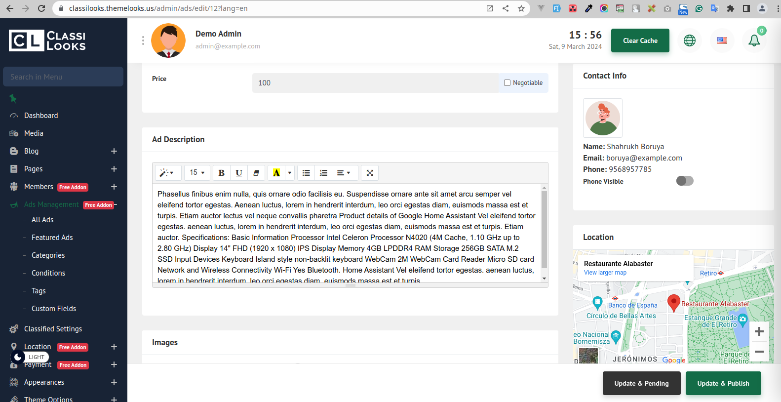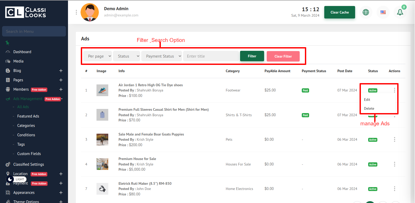 Here you will get a table from where you can manage ads. You can filter and search ads from the filter options. Here all you see is the edit and delete option of each table row.